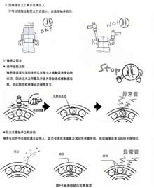 轴装轴承时,如铁锤等直接敲击轴承端面可能损伤轴承,因此务须在套圈圆周上施加均等压力来装入套圈。又,如对某一方的套圈(譬如外圈)施加压力,经由滚动体将另一方的套圈(譬如内圈)压人则滚道面会发生压痕或伤痕,应予避免。